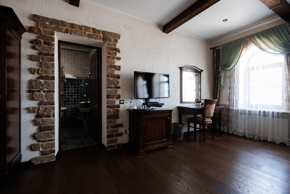 Гостиная с диваном, рабочим столом и телевизором с плоской панелью