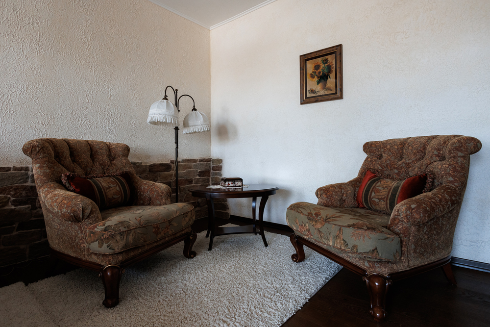 Гардеробная комната с туалетным столиком и большим зеркалом